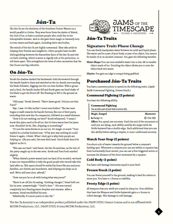 This ancestry drew upon themes of how a people can act for good when their time of power seems to be ending and something new is taking it's place. Do they cling to the power they had, or do they bolster good in the peoples to come. The Jún-Ta have very clearly chosen the latter. Choose the Communal Fighting trait and roleplay a hero who helps the next generation of heroes. Or choose other traits if you just want to be an ice person.