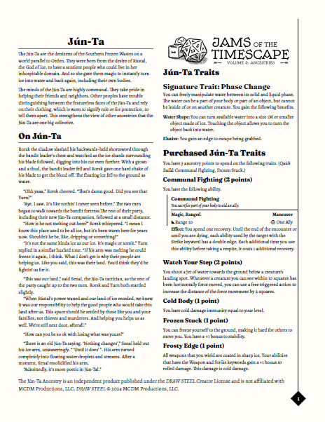 The Jún-Ta Ancestry is an independent product published under the DRAW STEEL Creator License and is not affiliated with MCDM Productions, LLC. DRAW STEEL © 2024 MCDM Productions, LLC.